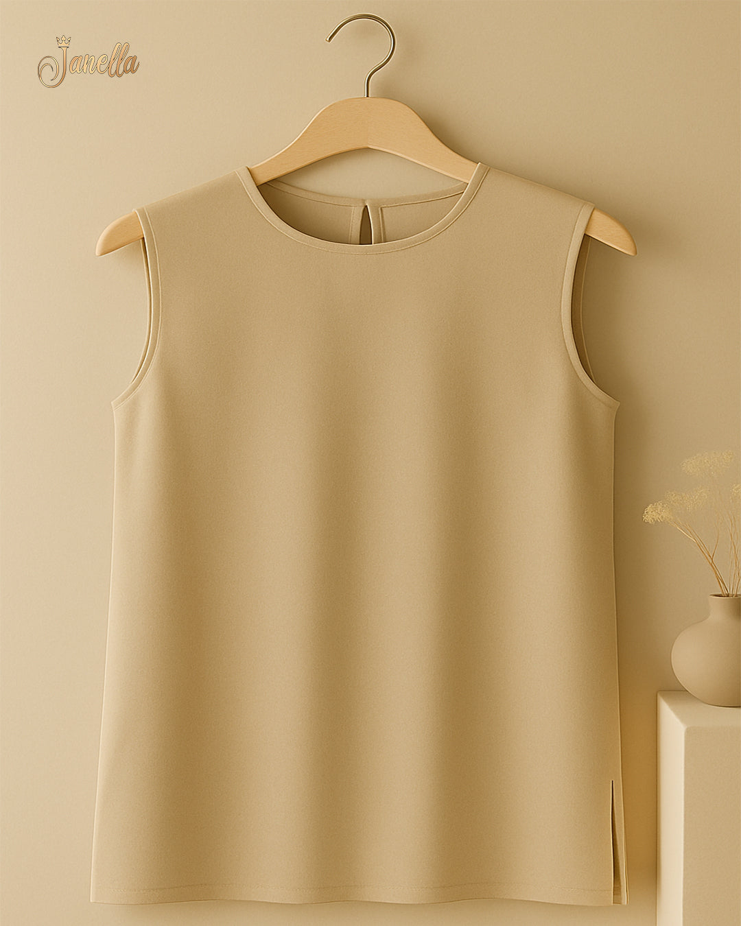 إطلالة كلاسيكية لا غنى عنها مع بلوزة البيسك الكت بدون اكمام . مصنوعة من خامة الروزالين المستوردة الناعمة عالية الجودة تمنحك الراحة طوال اليوم. التصميم البسيط يجعلها مثالية للتنسيق مع مختلف القطع، سواء للإطلالات الكاجوال أو الرسمية.